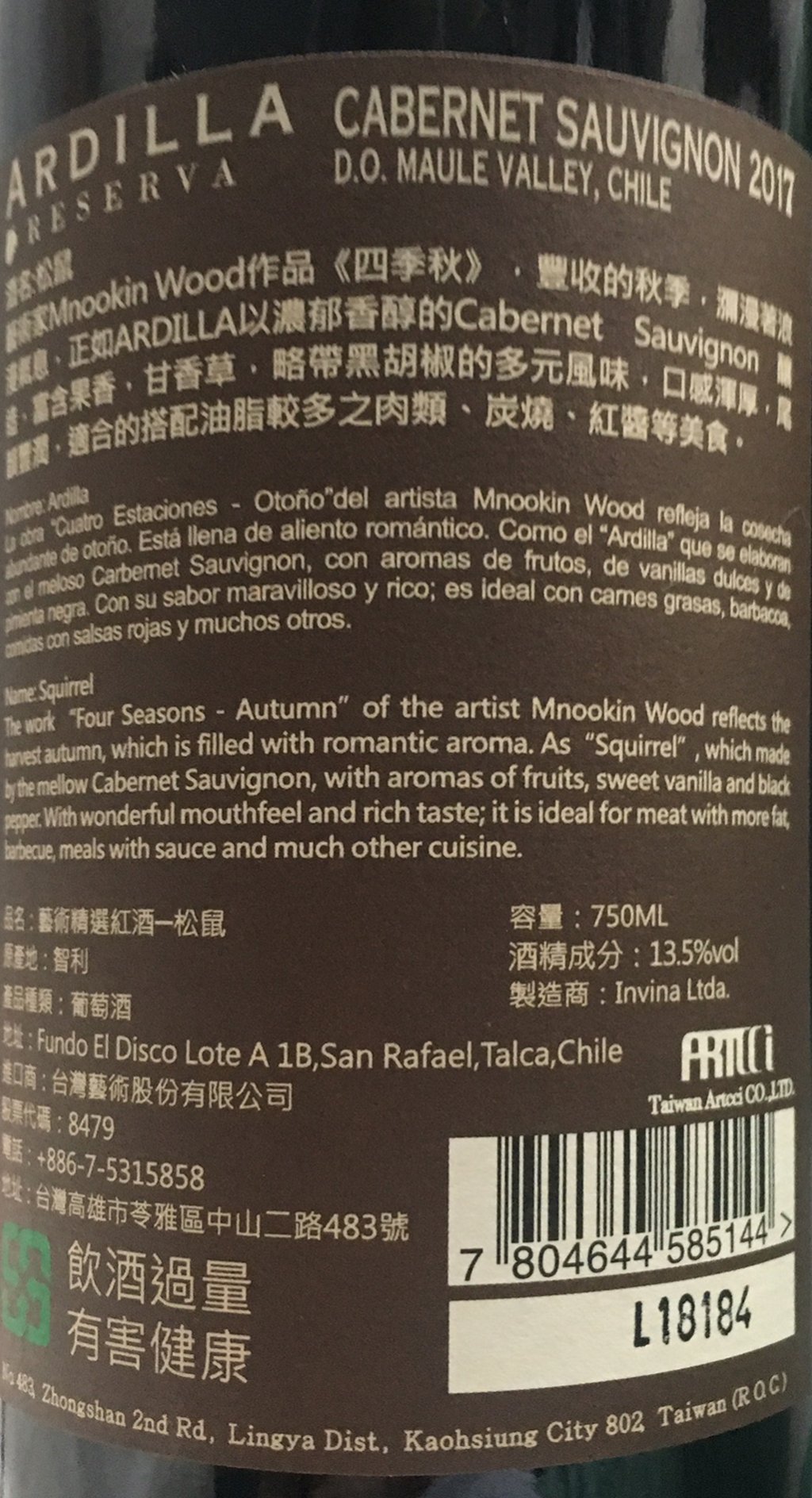 這件作品具有飽滿的橙黃色調,正如「松鼠Ardilla」這支酒以濃郁香醇的卡本內蘇維濃葡萄釀造,松鼠的大尾巴與果實的意象,帶出本酒渾厚、尾韻豐潤的口感,以及富含果香、甘香草的活潑風味。